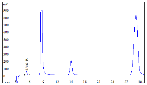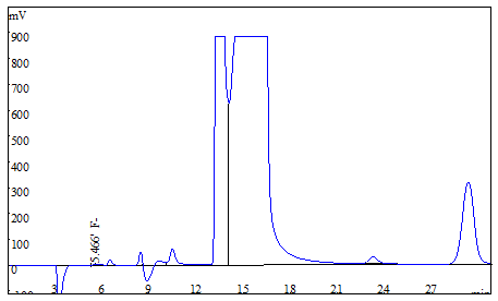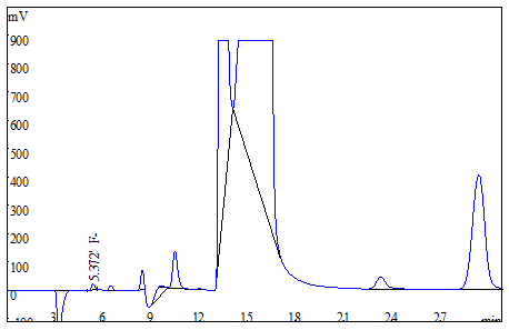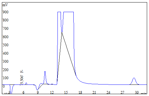 將大米、茶葉試樣分別粉粹后過(guò)篩,各稱(chēng)取0.25g(精確至0.0001g),于氧彈燃燒儀進(jìn)行燃燒,冷卻后定容,經(jīng)0.22μm的水系濾膜過(guò)濾后上機(jī)得到樣品譜圖,如下圖3、圖4所示;食用油樣品直接稱(chēng)重后進(jìn)行氧彈燃燒,測(cè)試得到的譜圖如圖5所示;生活飲用水直接上機(jī)后得到樣品譜圖詳見(jiàn)圖6。其中大米、茶葉、食用油中氟離子的測(cè)定結(jié)果均低于方法檢出限,同時(shí)對(duì)4種試樣進(jìn)行了加標(biāo)處理,加標(biāo)回收率在95.6%~102.3%之間。測(cè)試數(shù)據(jù)詳見(jiàn)表2。