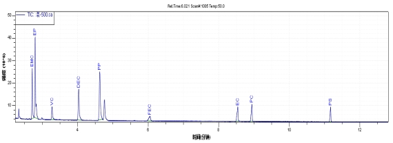 本方法采用天瑞儀器公司的GC-MS 6800氣相色譜質(zhì)譜聯(lián)用儀對(duì)鋰電池電解液中碳酸酯類(lèi)有機(jī)溶劑的分析,不僅可用于常規(guī)碳酸酯類(lèi)溶劑的準(zhǔn)確定性定量檢測(cè),也可用于電解液中未知有機(jī)組分的定性鑒定,有助于多方面了解電解液的組成。