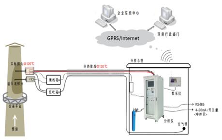 采樣探頭安裝于企業(yè)廢氣排口,排口被測廢氣被負(fù)壓抽泵抽取進(jìn)入采樣探頭探桿(不加熱),經(jīng)過陶瓷濾芯進(jìn)入伴熱管線(伴熱溫度可設(shè)置),樣氣在伴熱管中繼續(xù)傳輸至預(yù)處理系統(tǒng),在預(yù)處理系統(tǒng)經(jīng)過二級(jí)過濾和分流后按照一定流量送至在線氣相色譜儀(GC-FID)。在線氣相色譜儀控制內(nèi)置自動(dòng)取樣平面十通閥和定量環(huán)系統(tǒng)取1mL的被測樣氣,借助載氣送入色譜柱分離和FID做定性、定量分析。分析結(jié)果通過工控機(jī)保存,并和排氣筒監(jiān)測排放參數(shù)一起通過數(shù)采儀送至環(huán)保監(jiān)控平臺(tái)。